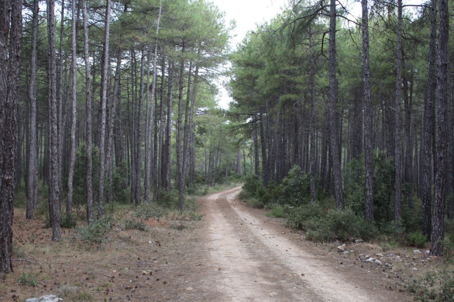 En el paraje del Corral del Pollo entramos en el Monte de Abajo y el paisaje cambia para caminar ahora por un espeso pinar. Poco después tomamos una pista en dirección norte por la que se baja hacia la vega del rio Mayor.