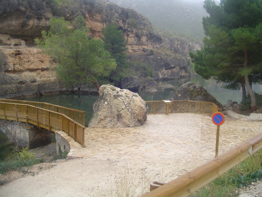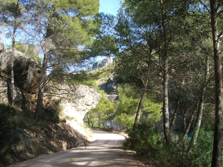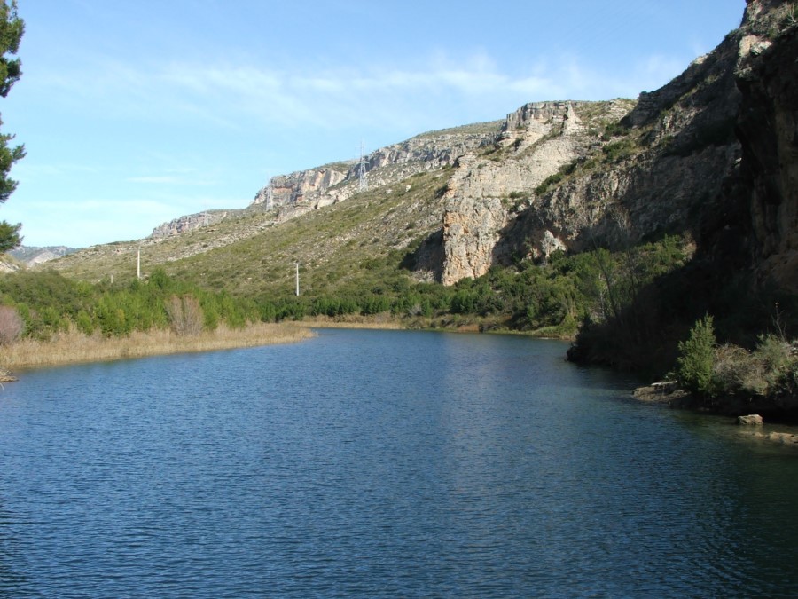Desde la presa del embalse, el sendero baja en busca del cauce, para seguir en dirección sur por la margen derecha de las aguas recién liberadas del río Guadiela. Caminamos por el fondo de un cañón, entre la sierra de Enmedio y la Sierra de Santa Cruz.