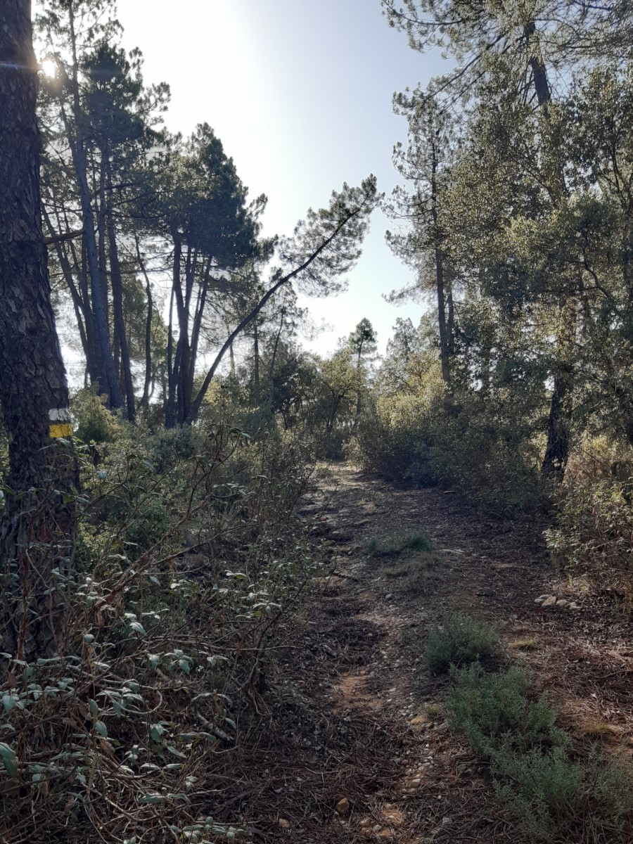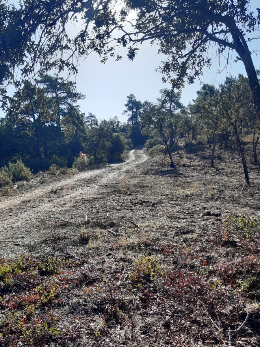 Mientras el encinar es cada vez más espeso, la subida se mantiene hasta coronar el Cerro pelado, donde entramos en zona de pinar. Sigue un tramo más relajado antes de subir de nuevo y bordear el cerro de Cabeza Serranos.