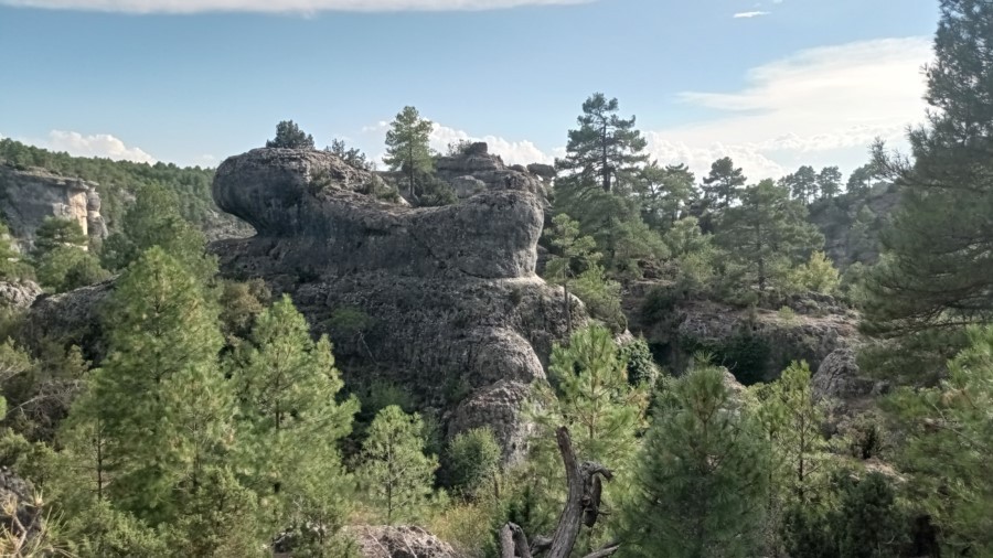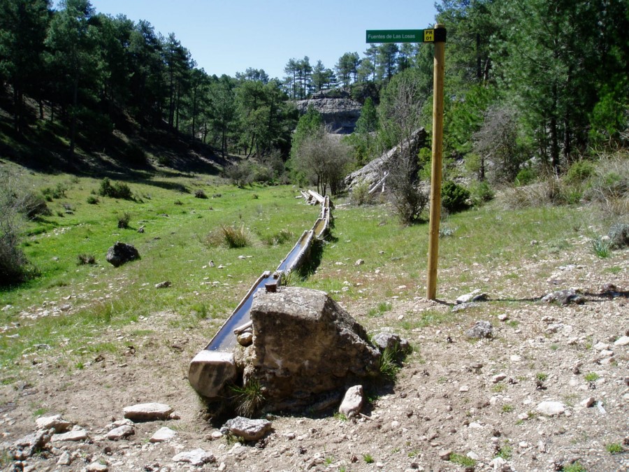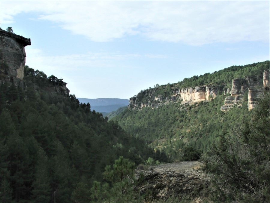 Salimos de Carrascosa por una zona sin arbolado, y tomamos una senda que se introduce, poco a poco, en un espeso monte de pinar. Paulatinamente el terreno se cierra y aparecen perfiles rocosos a ambos lados del vallejo. Finalmente nos asomamos a un profundo valle de elevados farallones; nos encontramos en la Hoz Somera (enlace con la Variante de la fuente de las Losas, de 1,5 km, que permite acortar el recorrido).