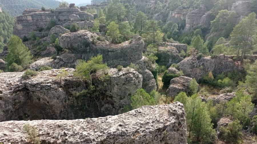 El sendero principal baja hacia el fondo de la hoz y cruza el cauce del arroyo. Caminamos ceñidos a la pared rocosa y subimos hacia el paraje de Los Castillejos, donde la caliza ha sido modelada por la erosión para crear caprichosas formas.