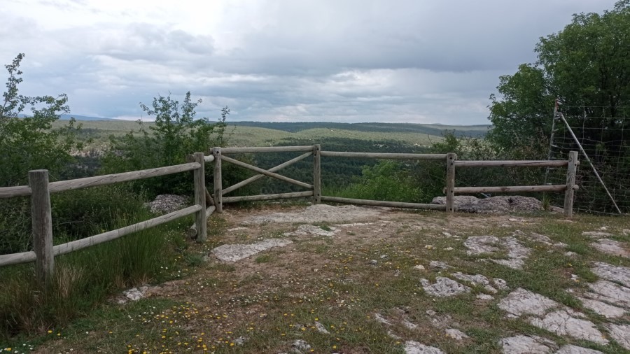 Recorremos ahora zonas abiertas y elevadas. La subida continúa por pista caminando junto a un vallado hasta el mirador del ceño, punto más elevado del sendero (1.322 m.), con una amplia vista de la dehesa de Cotillas y Tierra Muerta.