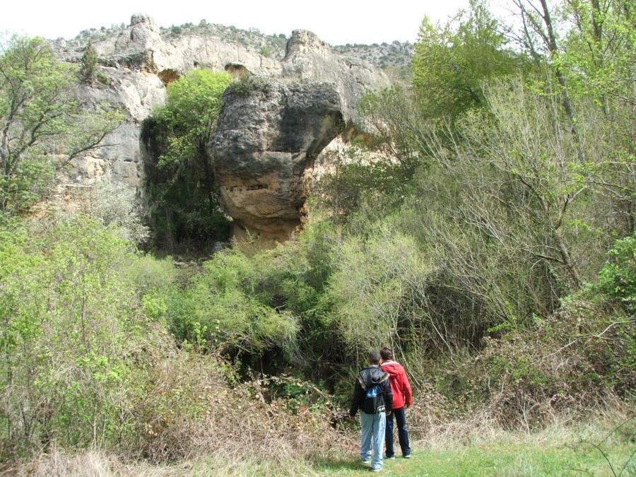 Desde la plaza de Palomera, una calleja de piedra sube una pendiente pronunciada y nos sitúa sobre la población. Avanzamos en dirección noroeste por una senda estrecha y sinuosa hasta la localidad de Molinos de Papel, recorriendo la parte superior de los farallones que delimitan la hoz y forman una terraza a mitad de ladera del cerro.