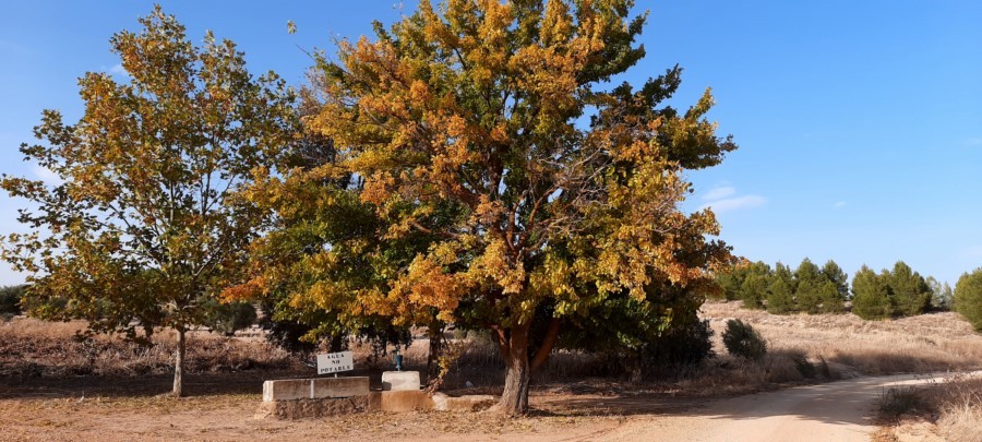Tras cruzar la N-301 se llega al pozo de El Aljibe, donde seguimos hacia el oeste para entrar al pueblo por la calle Mayor (este tramo urbano coincide con el GR 239 Camino de Santiago del Levante).