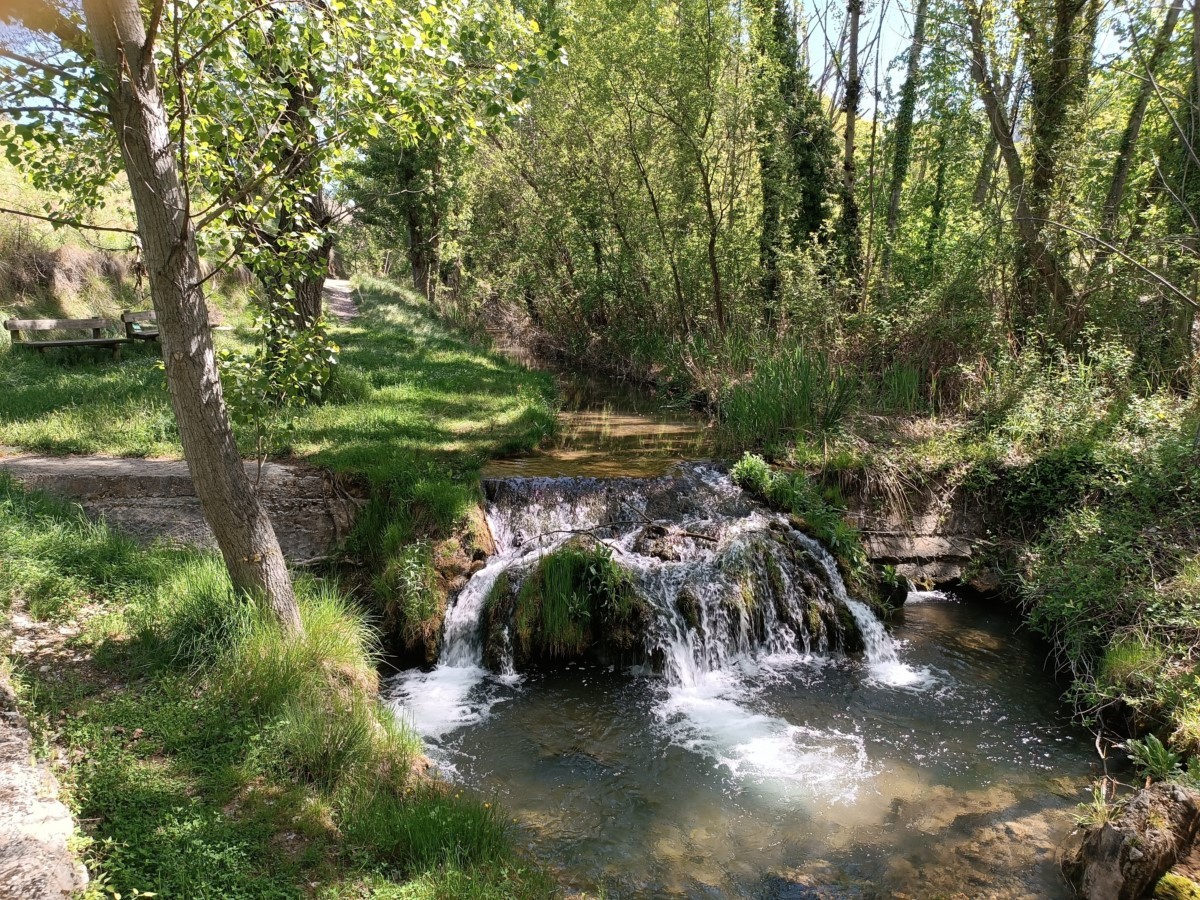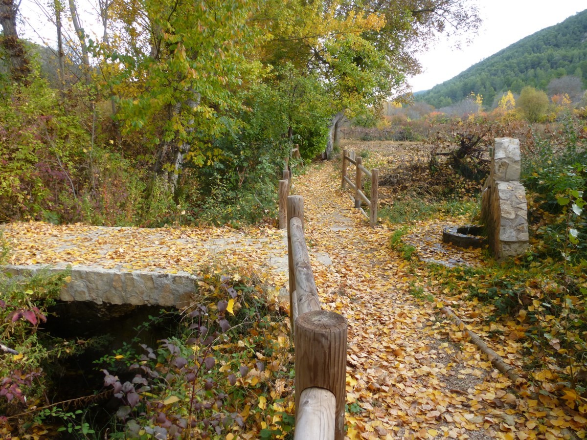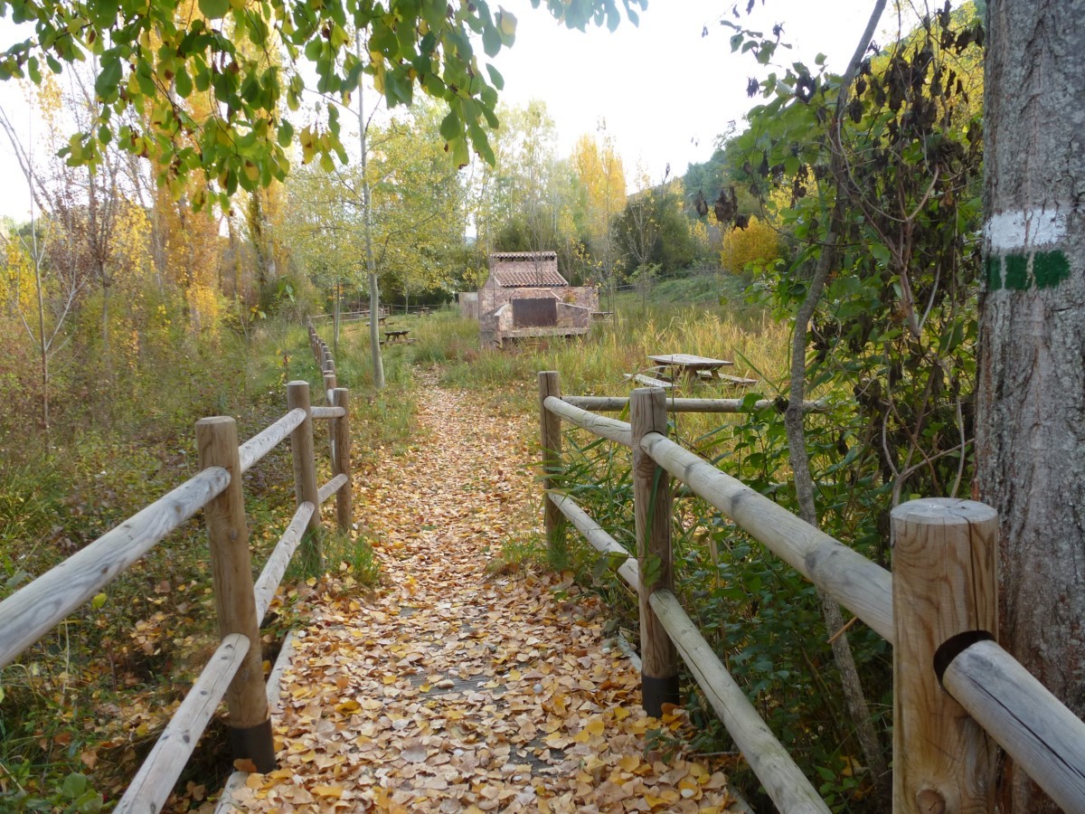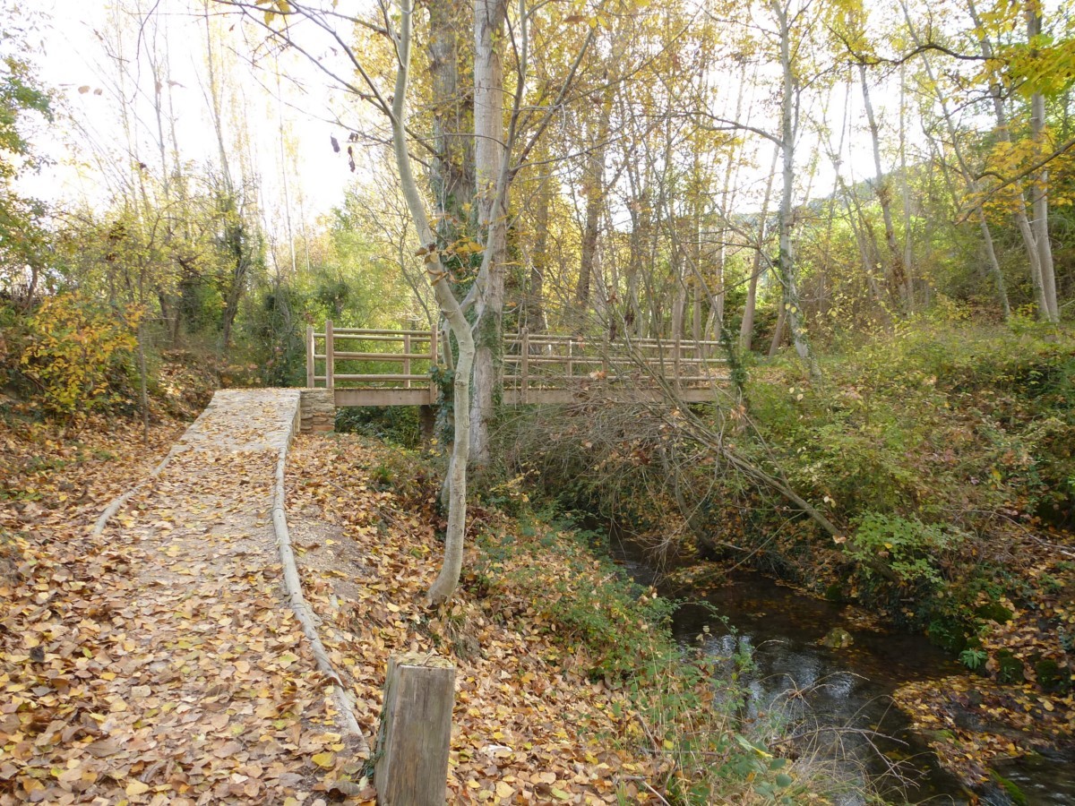 Atravesamos la carretera y un camino nos conduce hasta la orilla del río. Continuaos por una senda sinuosa, aguas arriba, bajo el bosque de ribera. Cruzamos el río por un puente de madera para situarnos en la margen derecha aguas arriba. Pasamos junto a potro puente de obra que no cruzamos y junto a la fuente de la Tía Chata. El bosque de ribera se ciñe al río y la vega se abre dando paso a pequeños huertos y terrenos de labor.