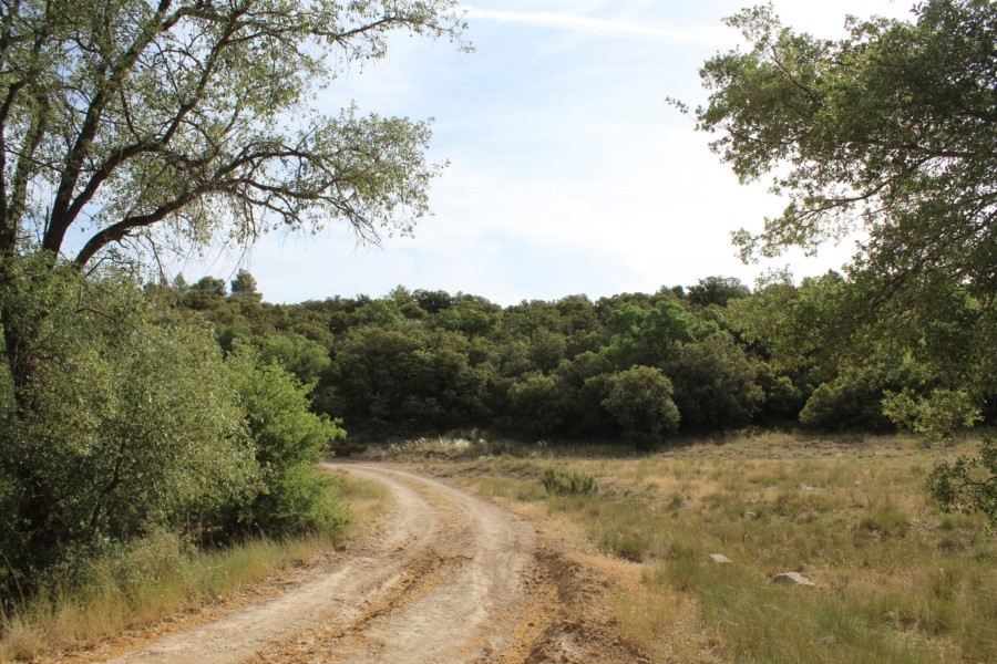 En el paraje del Corral del Pollo entramos en el Monte de Abajo y el paisaje cambia para caminar ahora por un espeso pinar. Poco después tomamos una pista en dirección norte por la que se baja hacia la vega del rio Mayor.