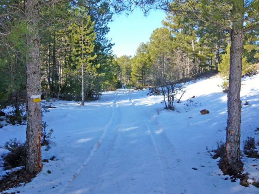 Salimos del entorno calizo para caminar ahora por una zona elevada, entre pinares, por un camino que termina en una pista, donde enlaza de nuevo con la Variante antes de llegar a Carrascosa.