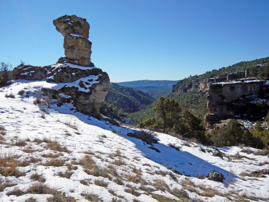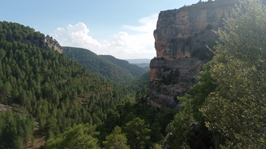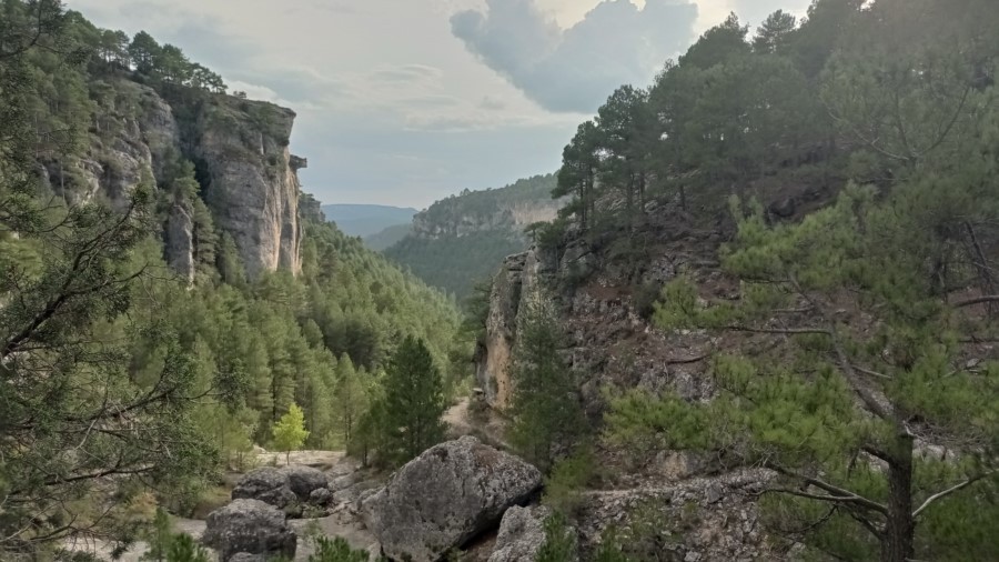 Salimos de Carrascosa por una zona sin arbolado, y tomamos una senda que se introduce, poco a poco, en un espeso monte de pinar. Paulatinamente el terreno se cierra y aparecen perfiles rocosos a ambos lados del vallejo. Finalmente nos asomamos a un profundo valle de elevados farallones; nos encontramos en la Hoz Somera (enlace con la Variante de la fuente de las Losas, de 1,5 km, que permite acortar el recorrido).
