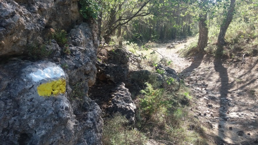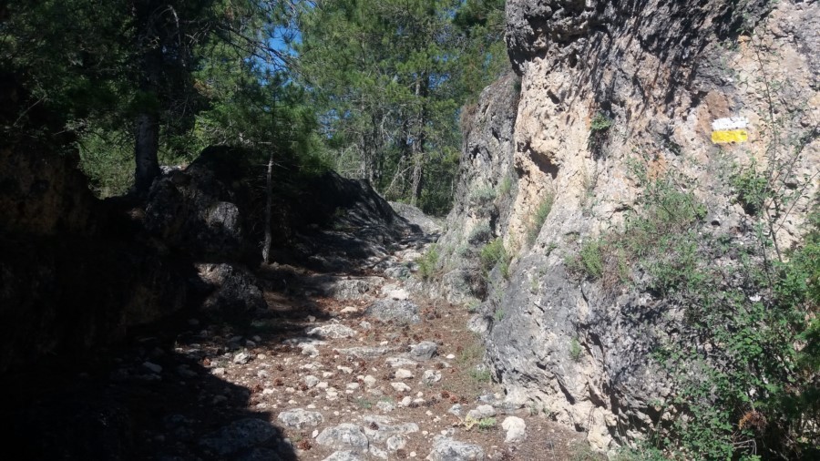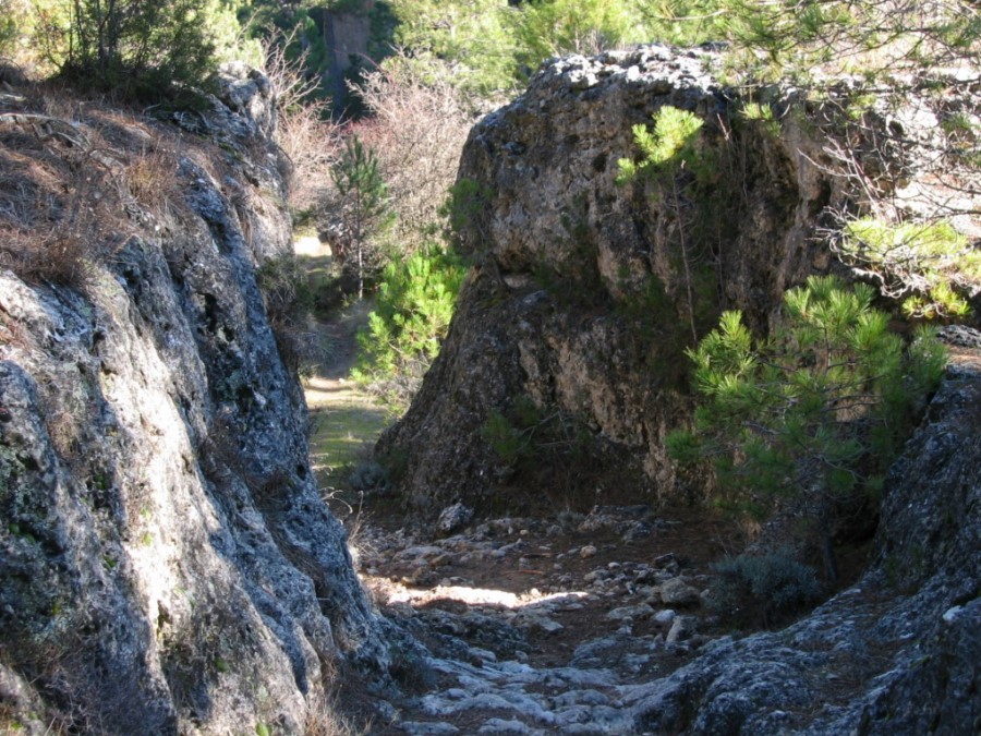 Ahora se inicia una larga bajada por el Portillo del Tabaco, donde se toma una senda que baja bruscamente, coincidiendo con el trazado de la Cañada Real Conquense hasta el barranco de los Caballero.