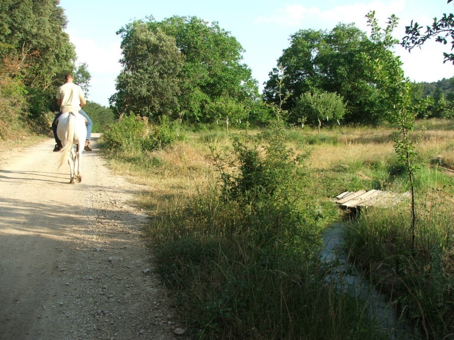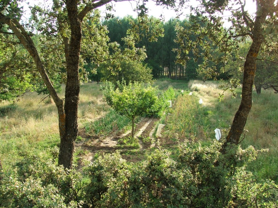 Antes de llegar al edificio de La Herrería, cambiamos el sentido de la marcha y giramos hacia un camino de herradura que sale a nuestra izquierda, en dirección a la dehesa de las Covatillas. La vegetación se hace más espesa, y los pies de pino y carrasca más numerosos.