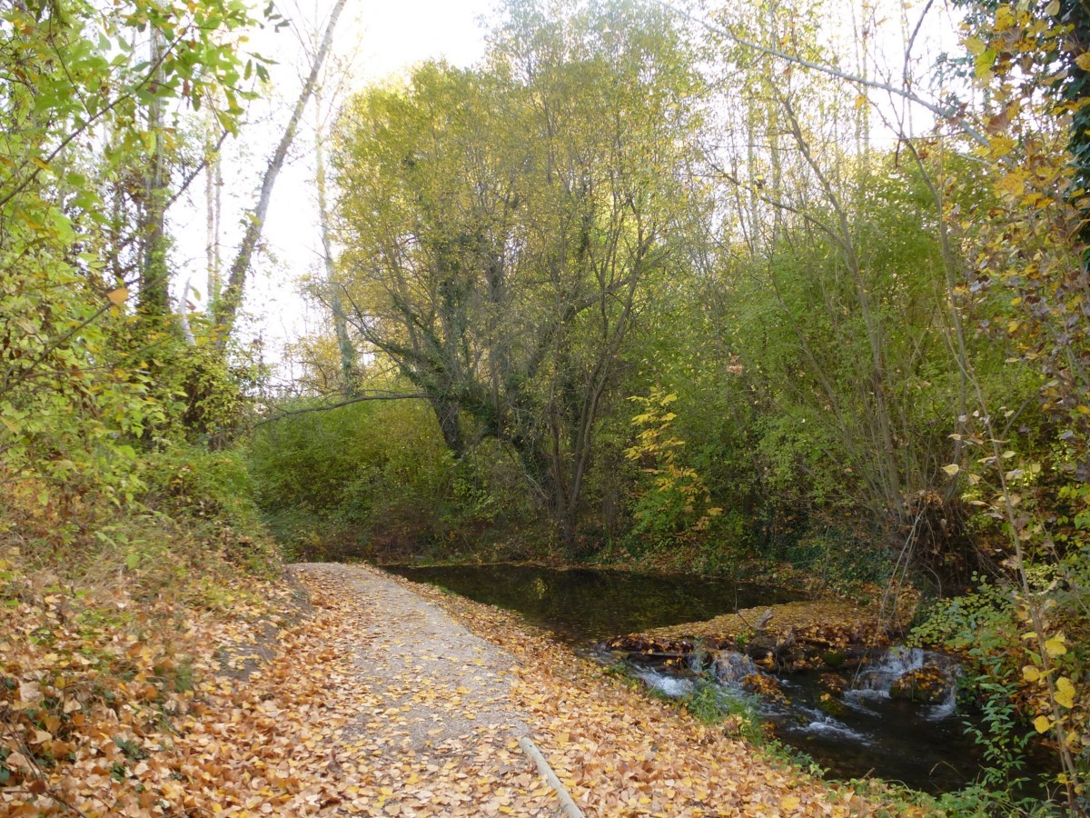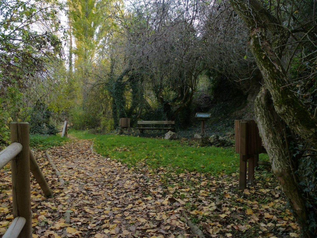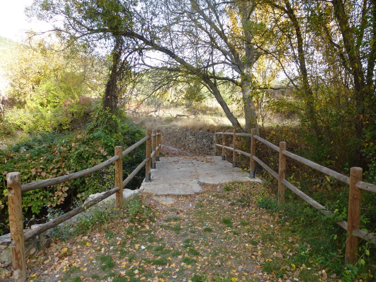 Atravesamos la carretera y un camino nos conduce hasta la orilla del río. Continuaos por una senda sinuosa, aguas arriba, bajo el bosque de ribera. Cruzamos el río por un puente de madera para situarnos en la margen derecha aguas arriba. Pasamos junto a potro puente de obra que no cruzamos y junto a la fuente de la Tía Chata. El bosque de ribera se ciñe al río y la vega se abre dando paso a pequeños huertos y terrenos de labor.